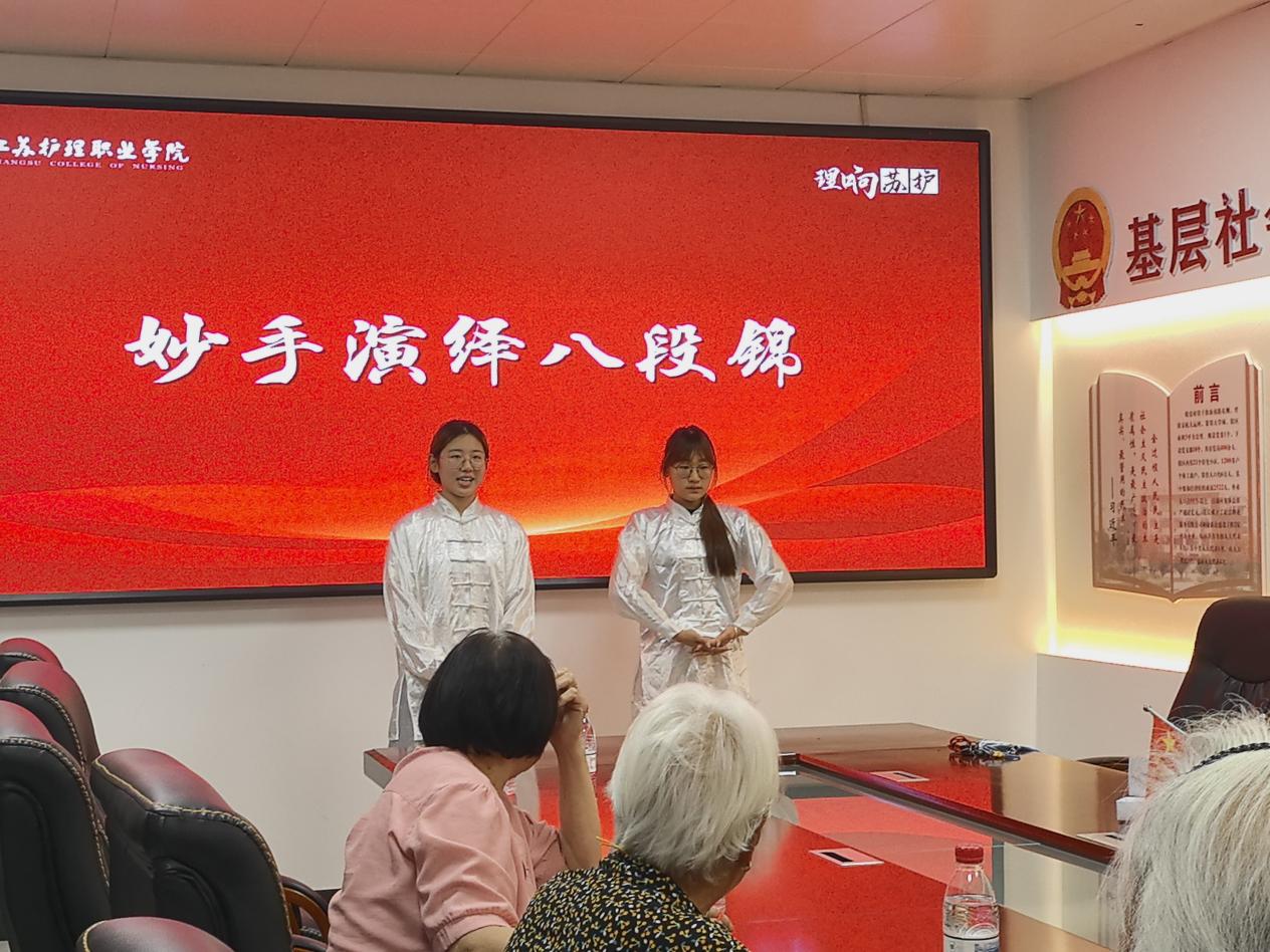 知识宣讲结束后,进行了急救技能展示:心肺复苏与海姆立克急救法。通过最直观的演示展现了生活中可能遇到的危险,并教会大家应对之法。“上托擎起千斤重,下落关节依次松。”最受大家欢迎的还是八段锦教学环节,老师一招一式的演示,居民们一笔一画地学习,经过几次学习逐渐掌握了要领,在一呼一吸之间感受着传统养生功法带来的身心愉悦。