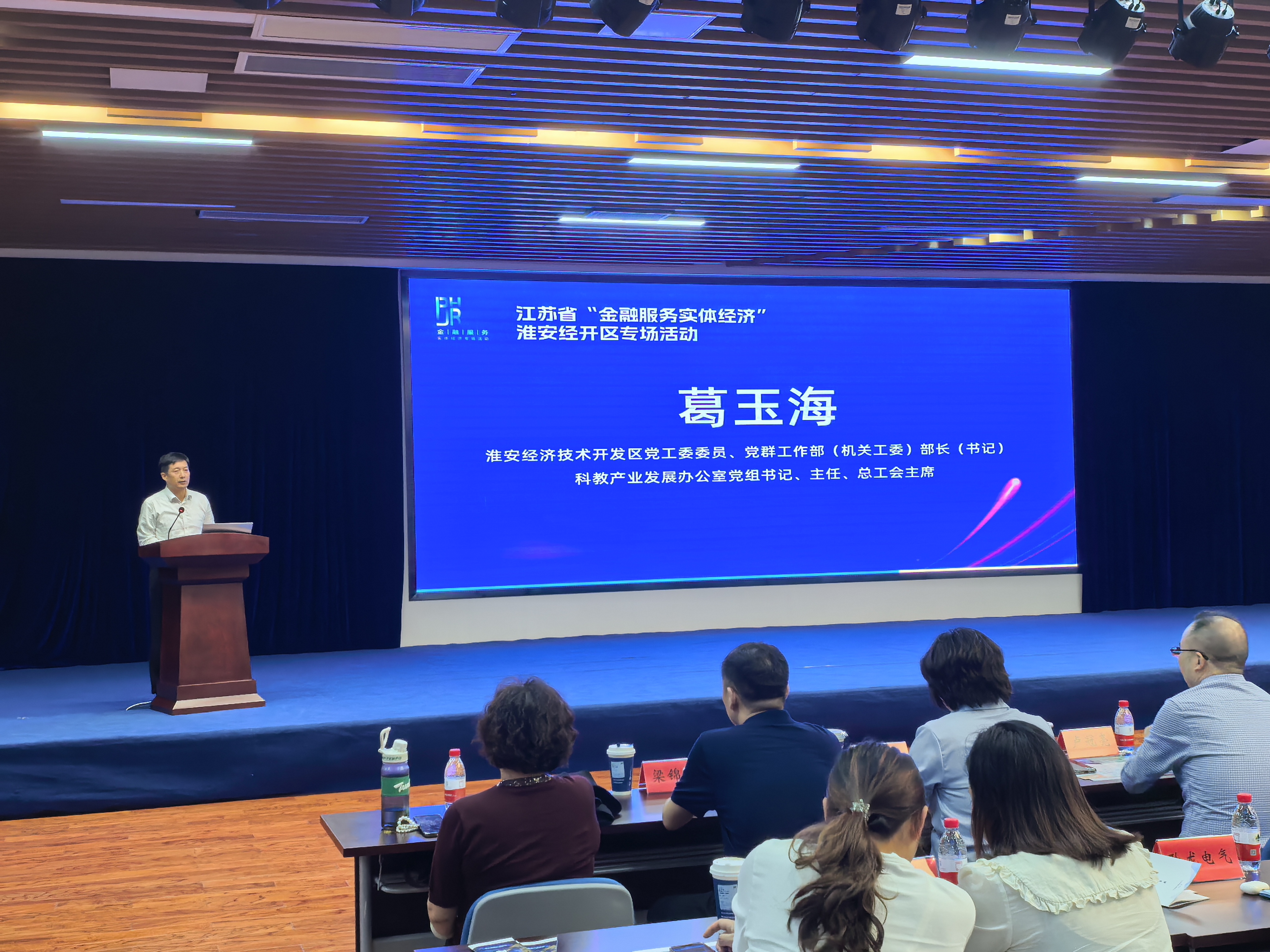 活动伊始,淮安经济技术开发区党工委委员、党群工作部(机关工委)部长(书记)、科教产业发展办公室党组书记、主任、总工会主席葛玉海致辞。他指出,经开区始终将金融服务实体经济作为推动高质量发展的重要抓手,通过主要领导与金融机构深度对接、优化金融生态环境等举措,持续打通金融资源流向企业的“最后一公里”。截至2025年6月底,区内金融机构人民币存款余额达587.5亿元,贷款余额910.21亿元,政府性融资担保在保余额36.57亿元,担保倍数5.76倍,多项指标位居县区前列,为实体经济发展提供了坚实金融支撑。同时,他强调经开区正通过“3+3”产业赛道与“创新之核”四大产业布局构建现代产业体系,已培育国家级专精特新“小巨人”企业5家、省级专精特新中小企业34家、国家高新技术企业181家,期待以本次活动为契机,进一步推动“科技—金融—产业”深度融合。
