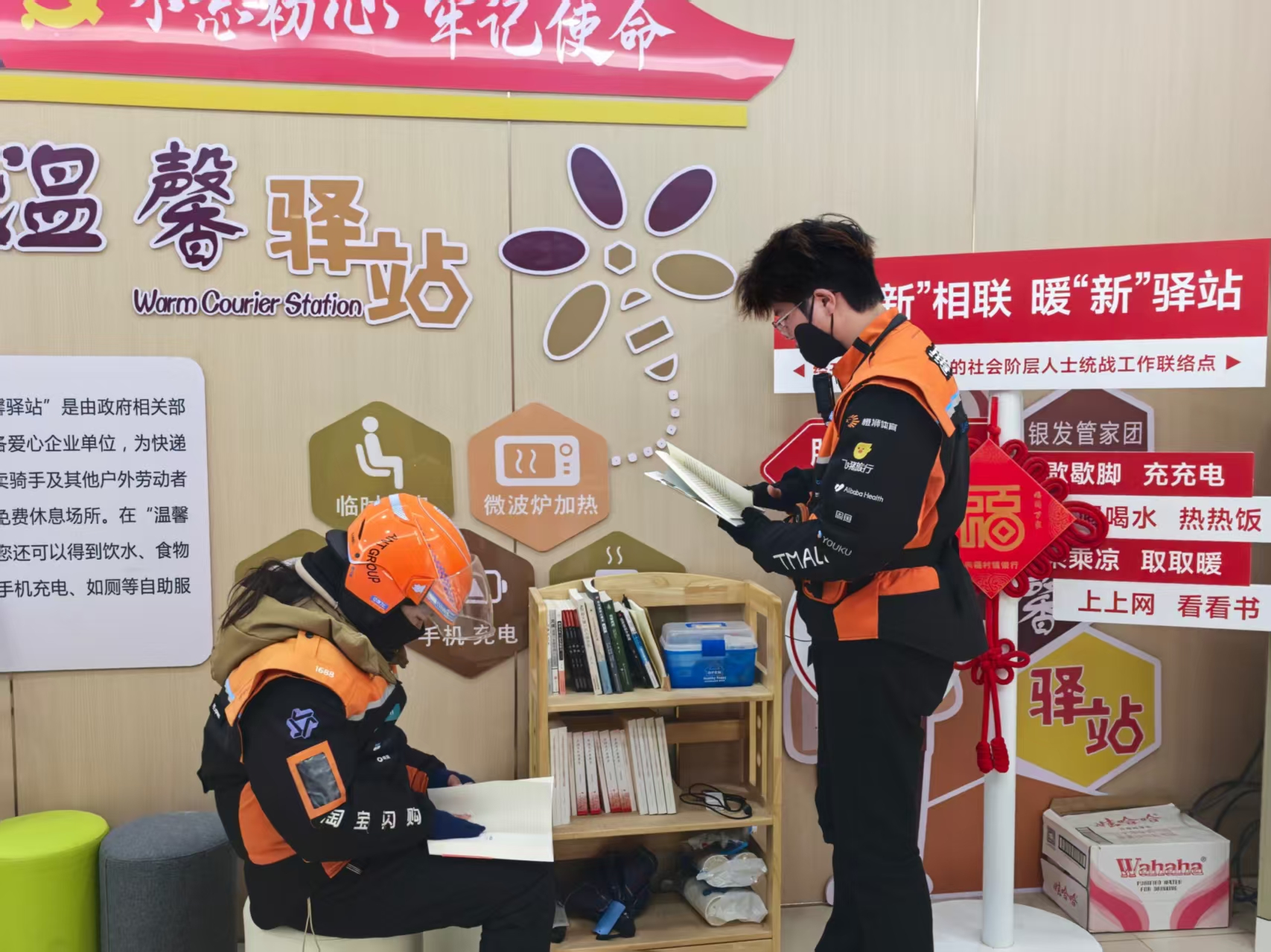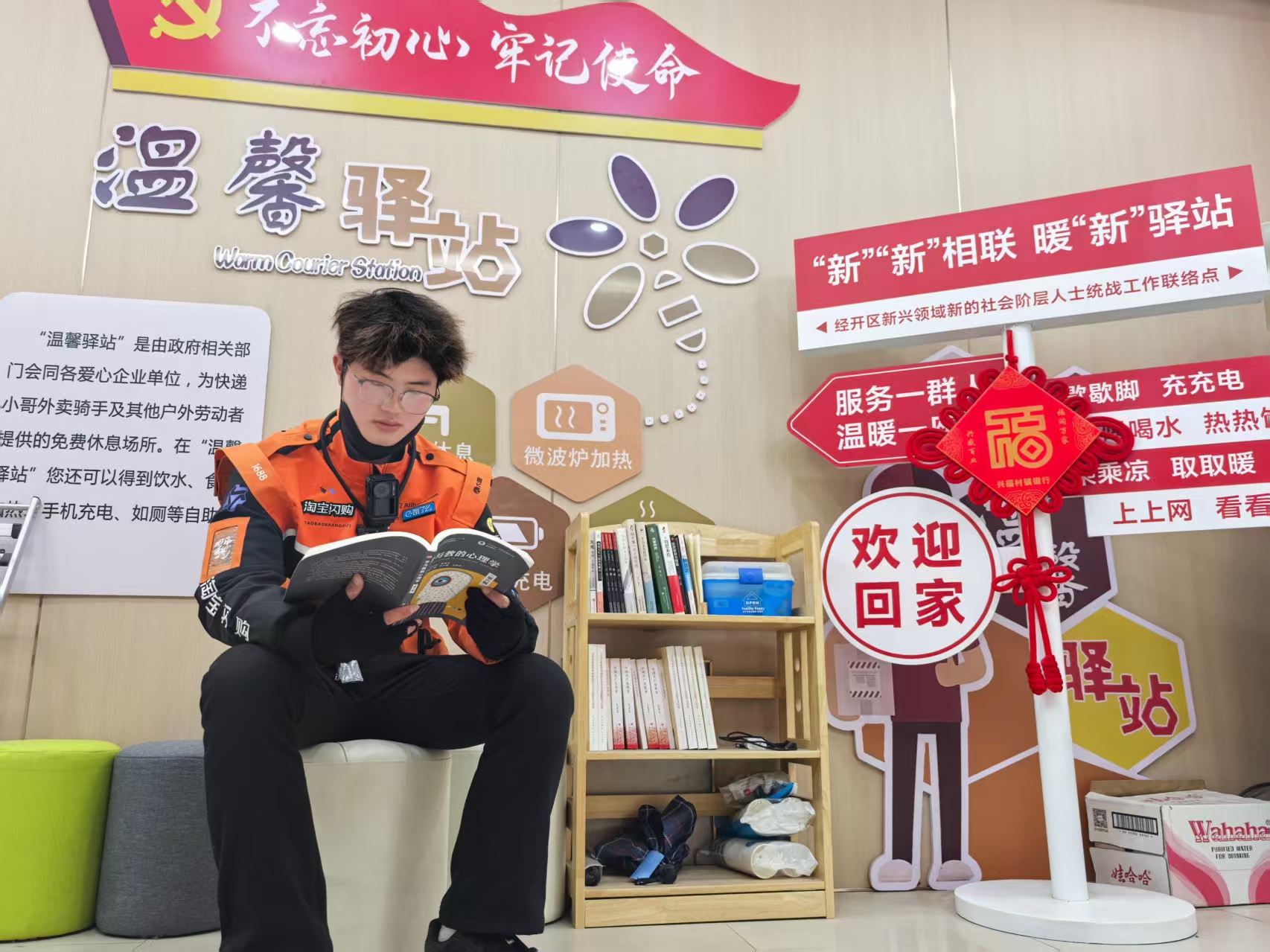 为让新就业群体在坚守岗位的同时感受节日温暖,枚乘街道温馨驿站春节期间不打烊、服务不断档,始终为户外劳动者敞开温暖大门。送餐间隙,不少骑手走进驿站歇脚休整,在这里喝上一杯热水,缓解奔波的疲惫;给手机及时充电,保障工作的顺畅;还有骑手拿起驿站配备的书籍、静心阅读报刊,在忙碌的工作之余享受片刻的安宁。贴心的自助服务,让驿站成为骑手们的“能量补给站”和“暖心避风港”,也让大家真切感受到街道关爱服务的温度与力度。